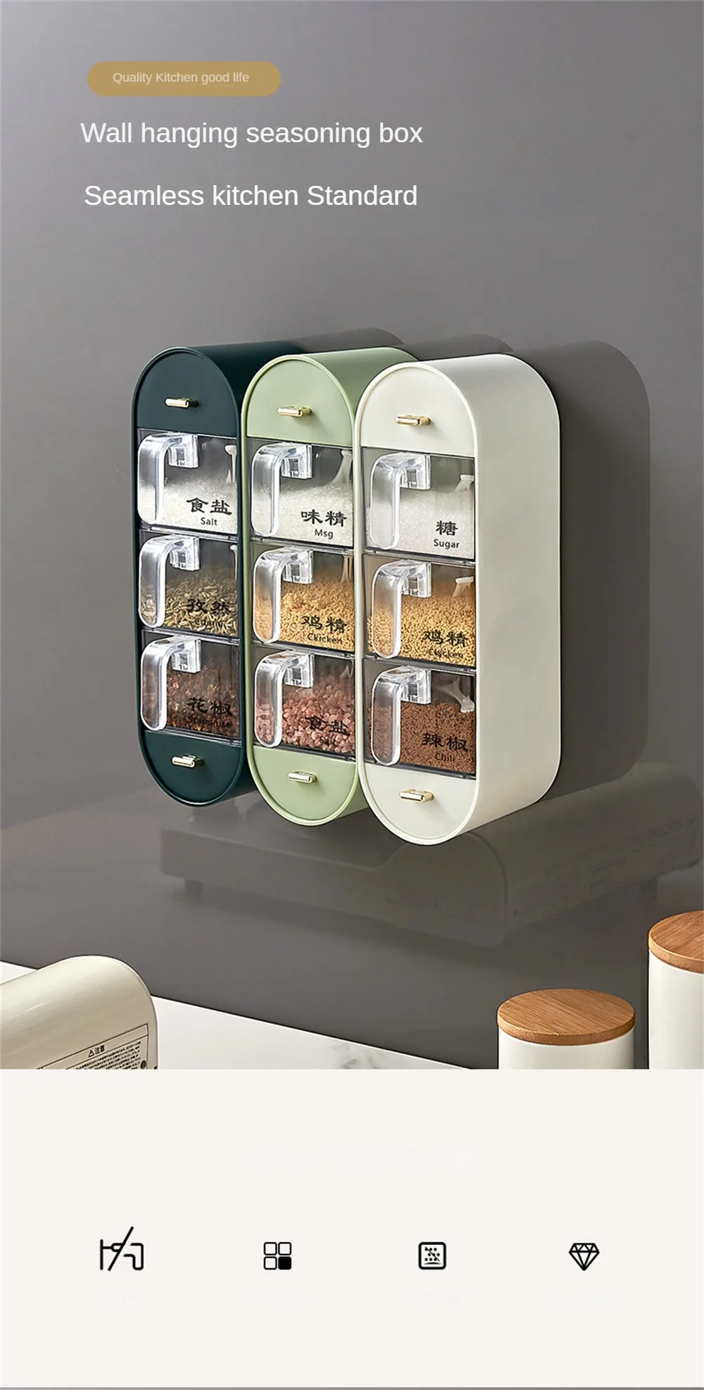 Pratique et ergonomique, chaque compartiment est équipé d’une cuillère pour doser vos épices à la perfection. Facile à installer, ce support est livré avec un autocollant sans trace et se monte en quelques minutes sans outils. Transformez votre cuisine en un espace moderne et fonctionnel avec cette boîte de rangement murale, conçue pour durer tout en ajoutant une touche de style.