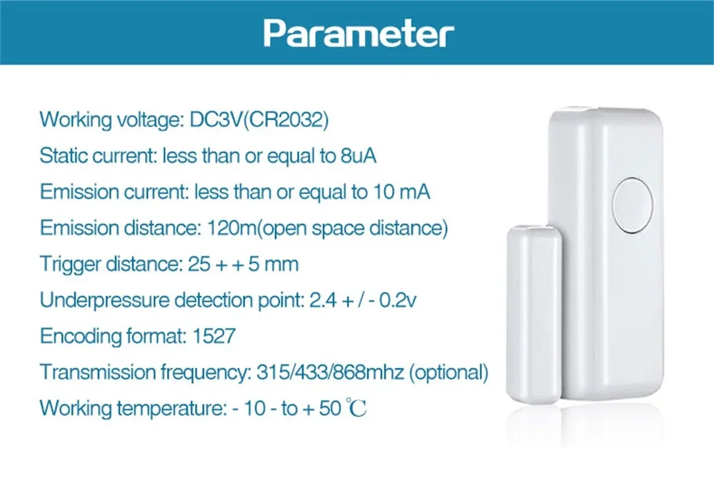 Avec un fonctionnement à basse tension (DC 3V) et une fréquence d’émission stable de 433MHz, ce capteur garantit une fiabilité maximale dans son fonctionnement. Il est également compatible avec une large gamme de systèmes de sécurité, incluant tous les hôtes PGST et les dispositifs utilisant les paramètres suivants : fréquence 433MHz, code IC 1527 et résistance de 330K Ω. Il s'intègre parfaitement dans votre écosystème de sécurité domestique, renforçant ainsi la protection de votre foyer ou de vos locaux professionnels.